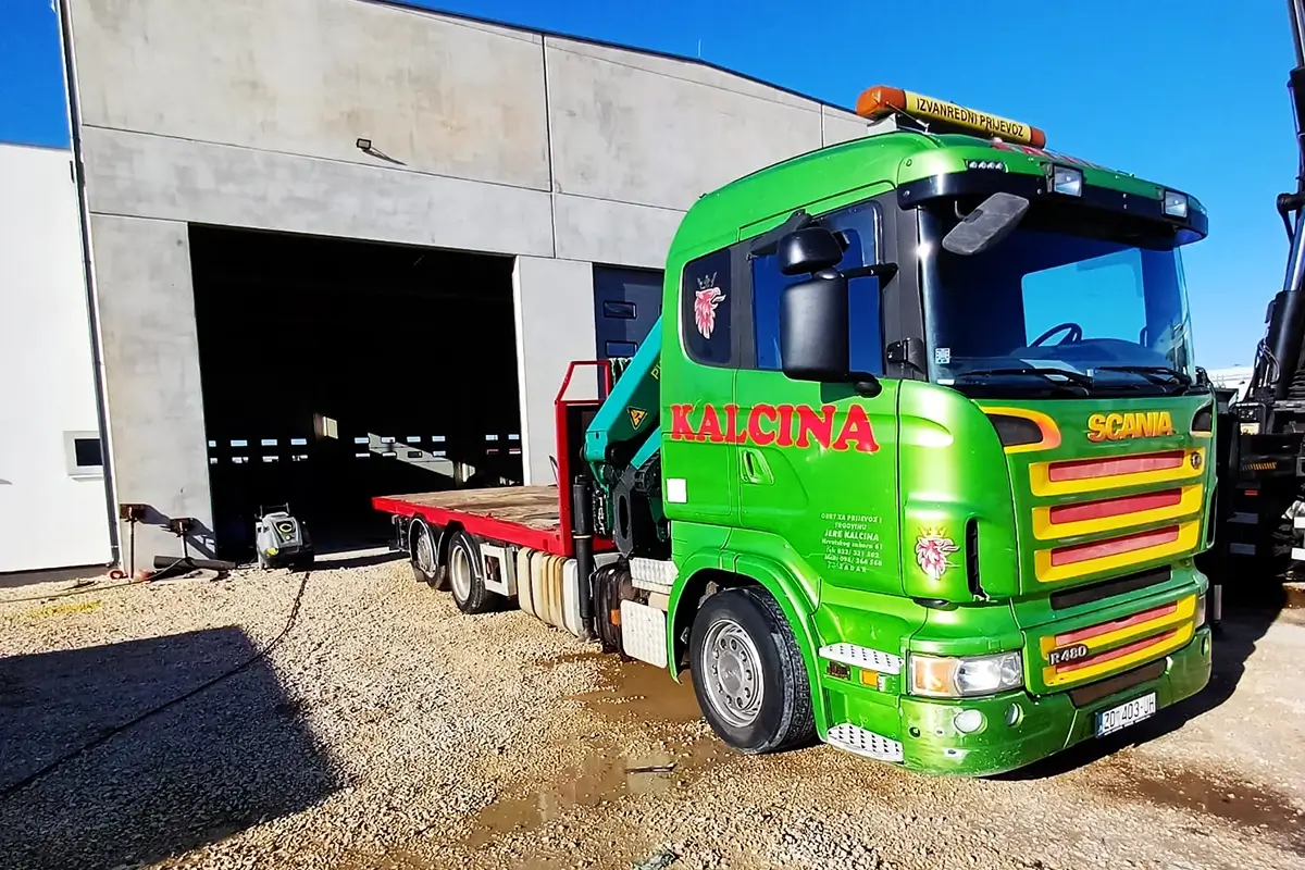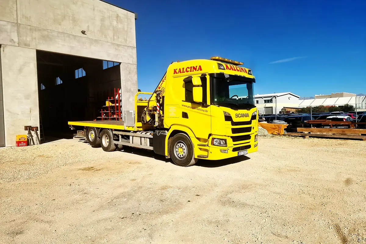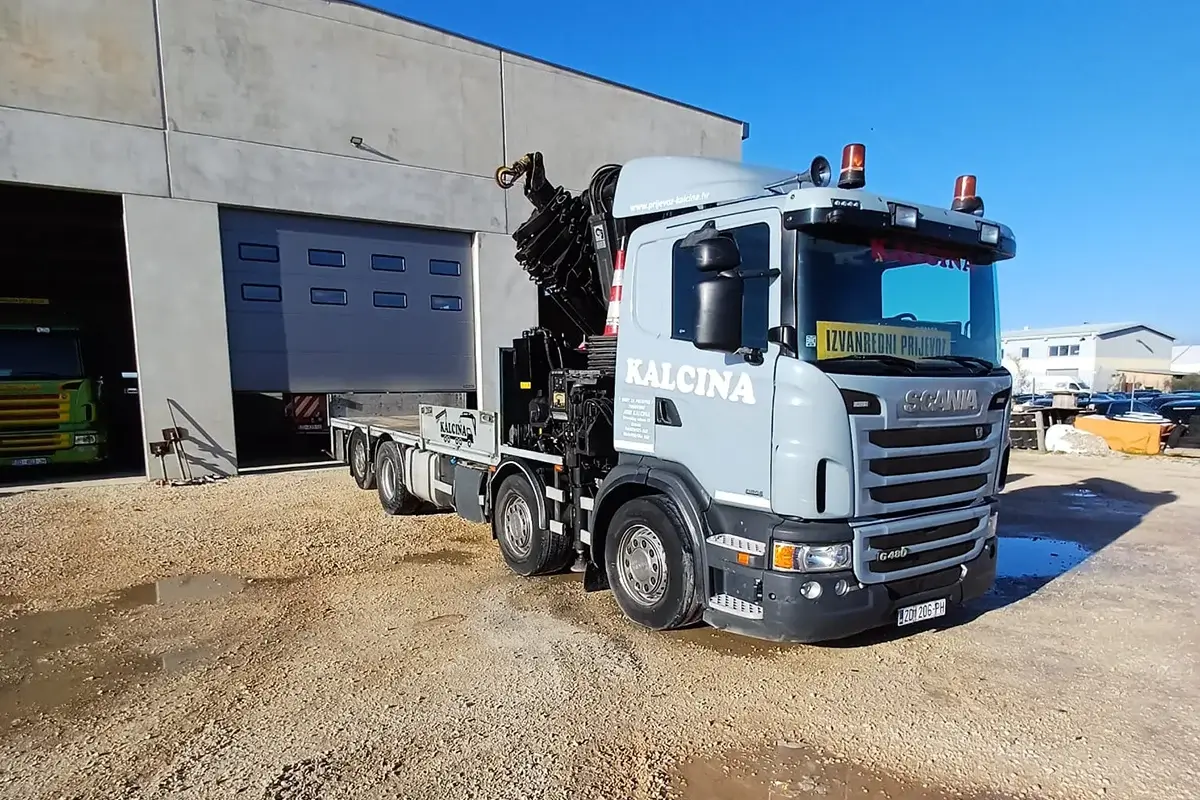 Kamion • Dužina tovarnog prostora: 6,5 m • Dužina grane: 22 m • Nosivost dizalice: 8 t • Nosivost kamiona: 12 t KAMION S DIZALICOM – SCANIA G 450 6 x 2 + FASSI 315 AXP.28 Pogledaj